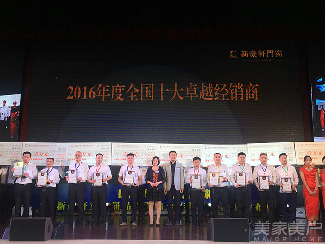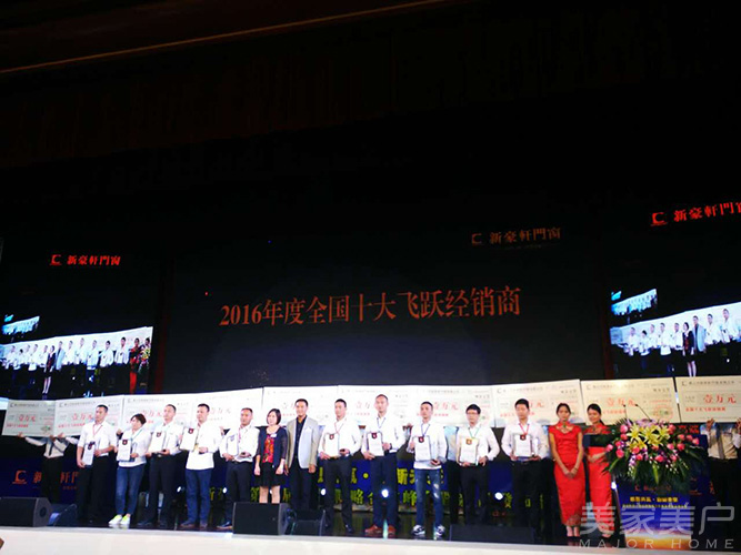 为了感谢经销商对新豪轩一直以来的支持,活动当天还举行了颁奖仪式。新豪轩董事长冯董事长及夫人2为优秀经销商颁奖,为表彰更多的优秀经销商对新豪轩的贡献,此次奖项从省级、地级市、县级都有表彰的优秀经销商。此外,还颁发了《2016年单店销量十大卓越经销商》、《2016年度全国十大卓越经销商》、《2016全国十大飞跃经销商》等奖项,约70人获奖,优秀经销商代表上台发表感言。