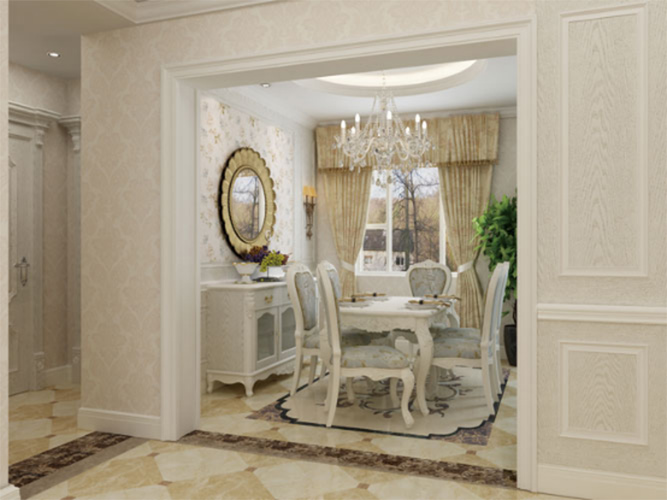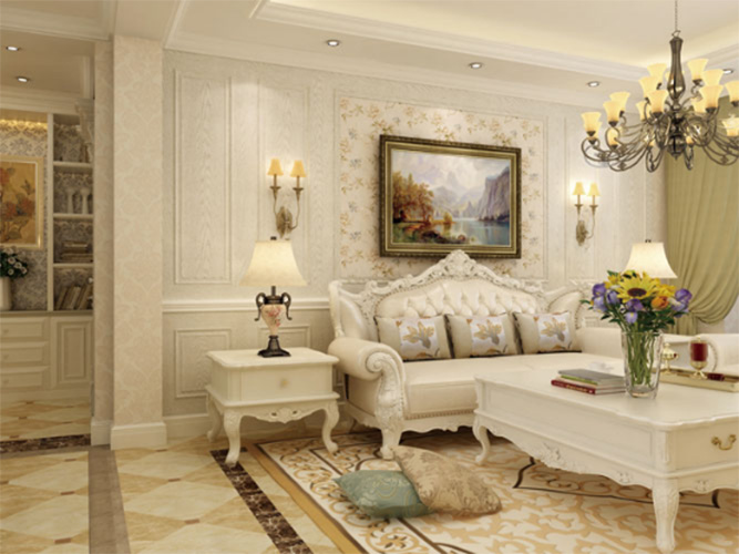 护墙板清晰的纹理,优雅的造型,与悬挂壁画的壁纸墙面巧妙搭配,错落有致,又与欧式家具的装饰元素巧妙地统一起来,整个客厅充满着欧式家庭的生活风情。