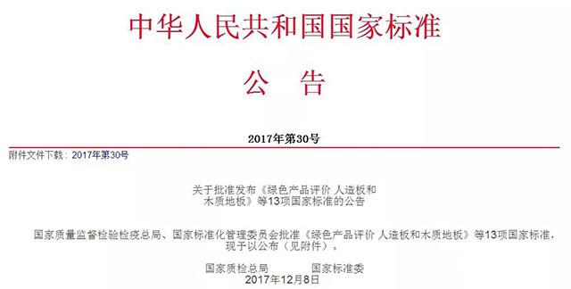 12月8日,由国家质量监督检验检疫总局、国家标准化管理委员会批准的《绿色产品评价 人造板和木质地板》等13项国家标准正式公布。《绿色产品评价 人造板和木质地板》是国家首批发布的13个绿色产品评价认证标准,大自然家居作为本标准排名第一的起草企业,充分体现了其在绿色产品生产及科研领域的专业性与权威性。