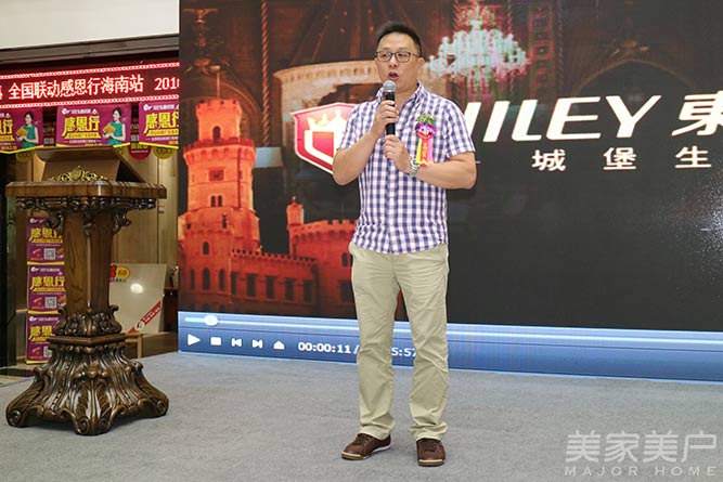 东威利海口旗舰店总经理于刚发言:“大家好,欢迎大家来到海口,尤其是远道而来的全国各地的东威利家人们,欢迎你们。在座都是行业里面的精英,我们都知道,产品只是产品,而产品后面传递的品牌的精神和文化,具有人性化和先进的设计理念,还有生产工艺上追求完美的品质,这一切,才是这个品牌的灵魂和精髓。东威利是一个有着悠久历史的品牌,起源于加拿大,发展于香港,遍布中国大陆地区,服务全球富户60余年。这一定位和我们诚辉公司致力为海南成功人士打造量身定制的品味生活是非常符合的。今天我们的主题是【齐鉴】,这个主题是有含义的,第一、我们的海口东威利展厅目前是东威利全国展厅最新,风格最多样,生活场景最丰富的旗舰展厅;第二、我们今天邀请在座的各位业界精英一起品鉴东威利带给我们的城堡生活。欢迎各位以后多给我们指导,我们需要向大家学习的地方还有很多。最后,祝各位来宾生活愉快,生意兴隆! 谢谢大家!”