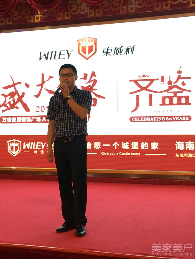 万佳家居装饰广场董事长罗文上台发言:“作为追求优质品牌和完善服务的建材卖场,我们万佳家居装饰广场也非常荣幸地引入东威利品牌,并且非常荣幸地看到全国的旗舰店落户万佳家居装饰广场。相信,通过东威利,海南诚辉公司以及万佳广场的共同配合,我们一定能携手共进,开创辉煌的未来!”