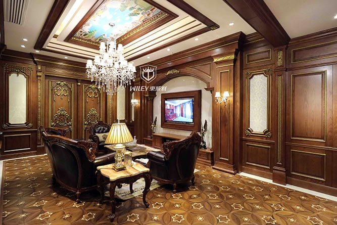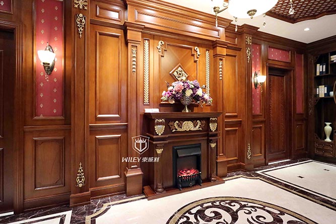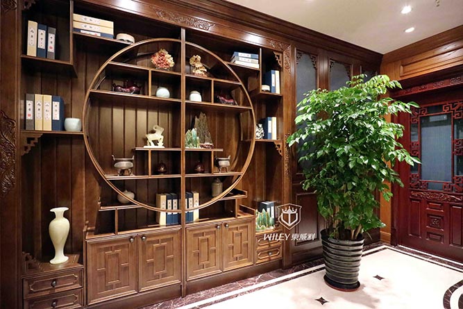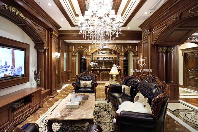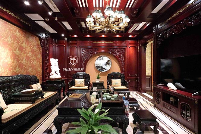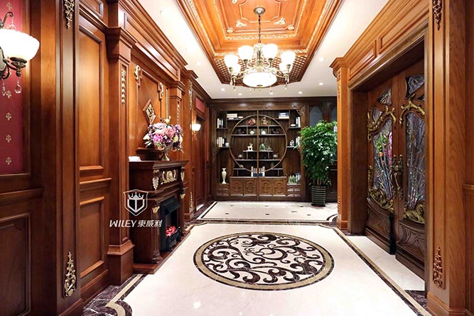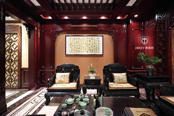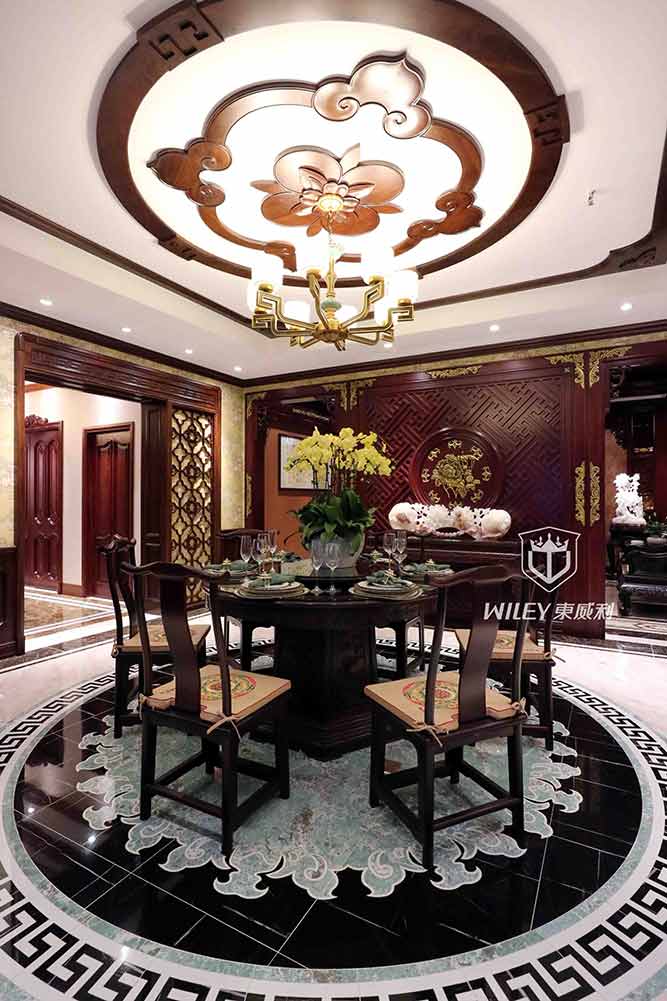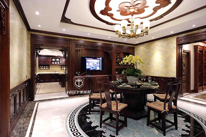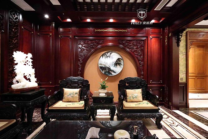 传统的中式风格,以庄重与清雅的双重品质内缔造室内空间,在空间上讲究层次,多用隔窗、屏风来分割;在室内布置、线型、色调以及家具、陈设的造型等方面,吸取传统装饰“形”“神”的特征,以传统文化内涵为设计元素如:回纹雕花,浮雕的祥云,镂空的云蝠图案,圆拱,方格,案台等;大厅用奥克木独有的细腻纹理,结合中式元素风格的设计,构成了中式古典大厅。
