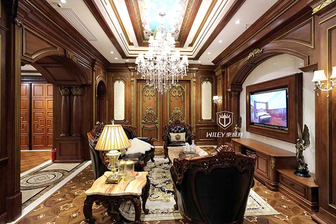 强调以华丽的装饰、浓烈的色彩、精美的造型达到雍容华贵的装饰效果。欧式客厅顶部喜用大型灯池,并用华丽的吊灯营造气氛。门窗上半部多做成圆弧形,并用带有花纹的线条勾边。入厅口处多竖起两根豪华的罗马柱,室内则有真正的壁炉或假的壁炉造型(本客厅采用超高豪华大门来替代,更显欧洲豪门气派)。欧式客厅非常需要用家具和软装饰来营造整体效果,精美的油画,制作精良的雕塑工艺品,都是点染欧式风格不可缺少的元素。