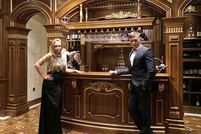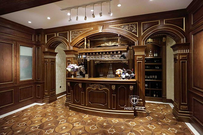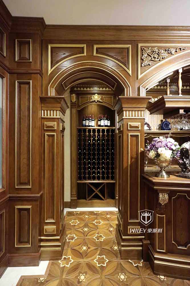 就是我们说的西式酒柜,它主要是在欧式展示柜基础上增加了酒架的组合。本欧式酒柜以简约高雅为整体设计,欧式的代表元素罗马装饰线和装饰柱穿插于酒柜柜顶、两旁及吧台;装饰线条、装饰柱及雕花件的描金,突出整体的立体感和层次感,整个欧式酒柜区都散发出典雅奢华的气质。