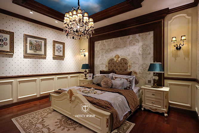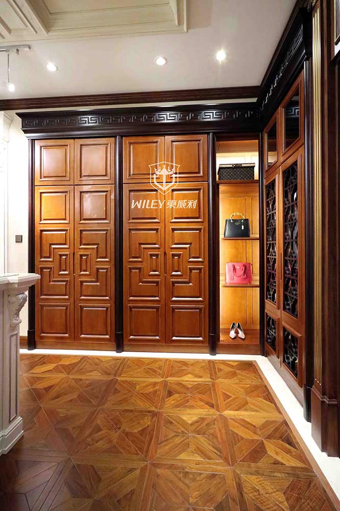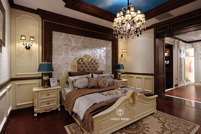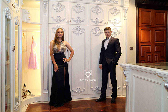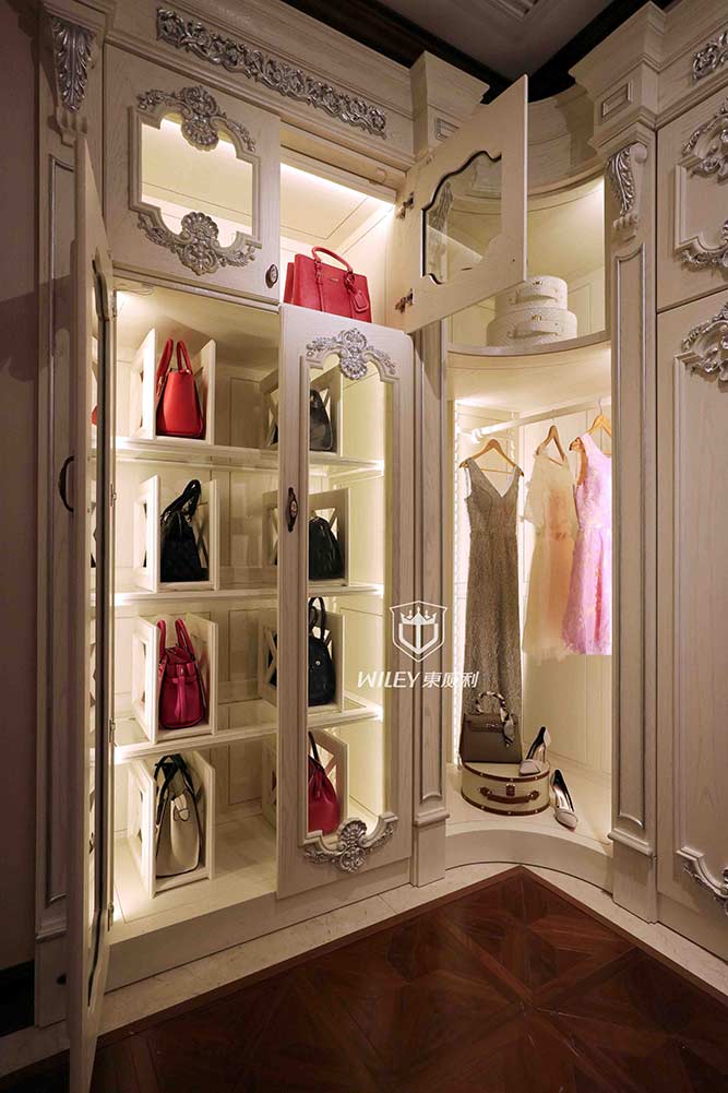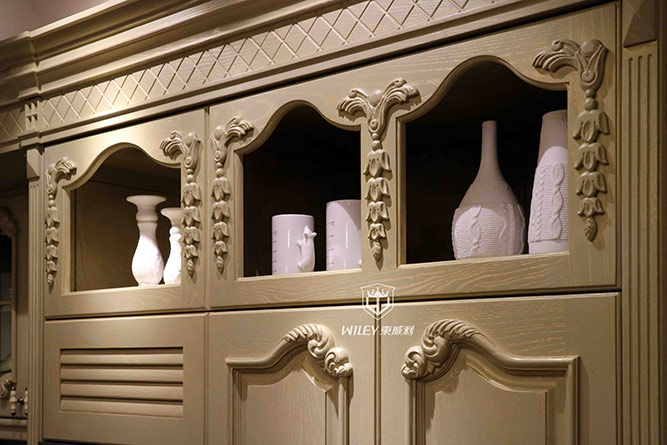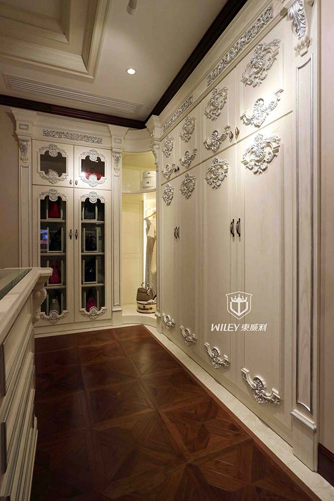 采用象牙白半开放加银光纹的油漆工艺,白栓木特有的粗犷木纹质感使得衣柜油漆面效果在光照下有一种闪银的质感,法式雕花件做了擦银效果更是让雕花有经典的复古感觉,充分体现法式奢华的尊贵。