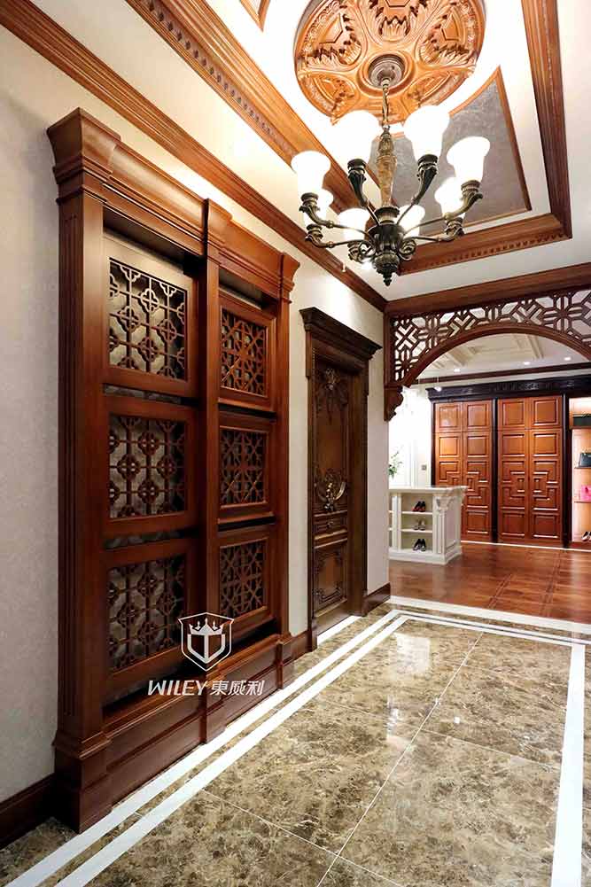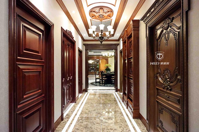 门连接着家里的不同空间,功能非常重要,也展示了业主的品味。此区域主要展示了东威利经典欧美风格的5个门款,分别使用了红桃木,沙比利,比刚木,白栓木等4个木种。