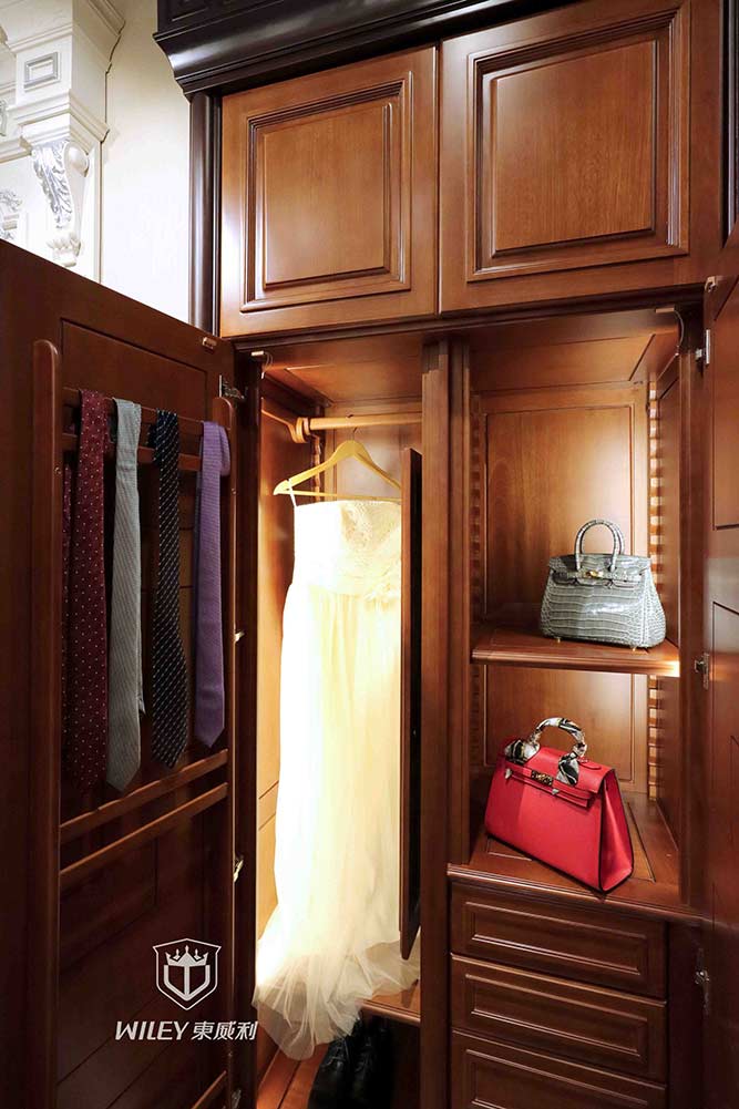 衣柜功能介绍:两款衣柜的设计都遵循了收纳,照明,私密等系统,让衣柜的在实用性基础上增添了人性化和智能化的设计功能;例如自动照明系统,可调节的高低的挂板卡位设计(已申请实用新型专利),柜中柜,隐藏柜,丝巾挂件,包包收纳,活动挂镜,领带架和裤架等。