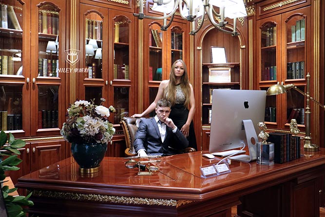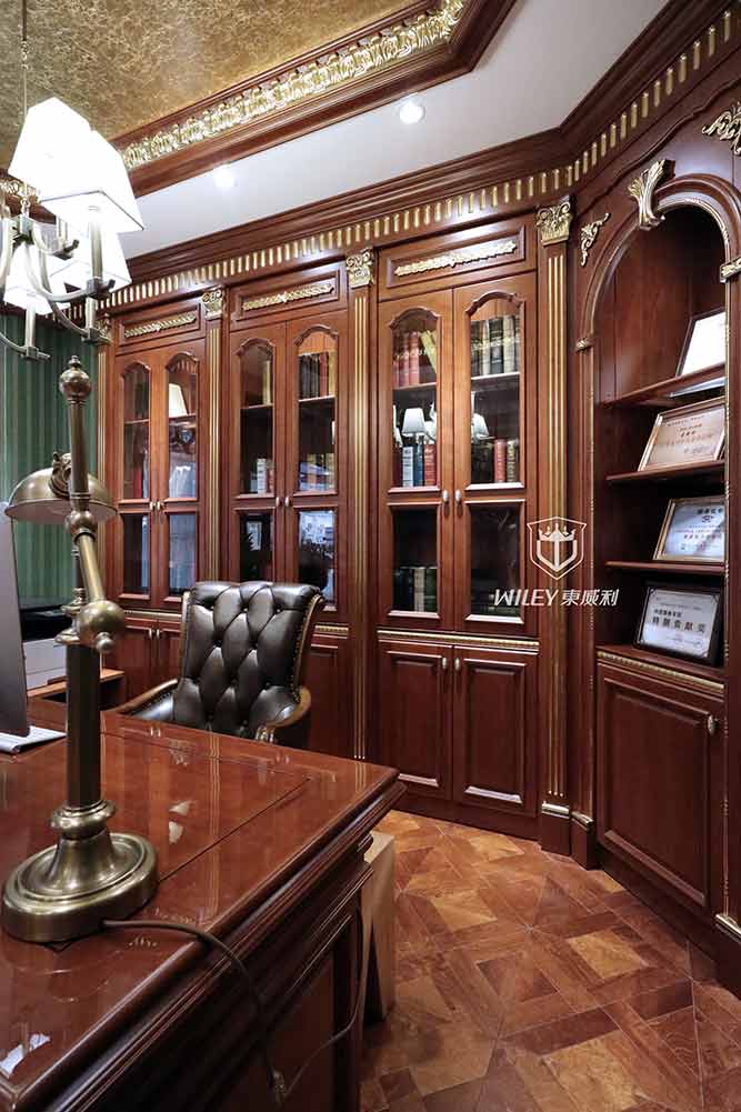 书房在现代生活当中的地位不容忽视,尤其是作为书香门第的家庭,书房代表着整个家庭的影响力,所以书房的装修也同样不容忽视。美式风格书房因其简约和现代化风格,逐渐被大家喜爱。本书房主要采用美国樱桃木,加贴金箔的工艺,让产品的质感更加强烈。