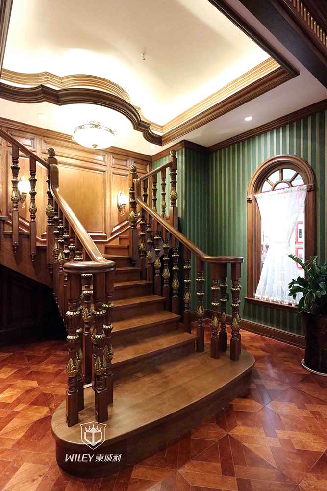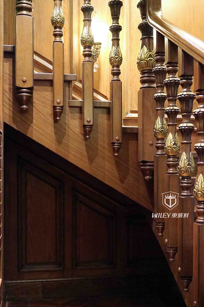 实木楼梯具有悠久的历史,造型和雕刻都具有深厚的历史沉淀和韵味;本区样板采用的是整体实木楼梯,没有做任何基础,在完全空白的空间设置楼梯,整体楼梯通过和上梁的固定连接来安装,梁、踏步、扶手、立柱完全统一。楼梯区还陈列了东威利公司最新最齐全的色板架,陈列着十几种进口优质木材做成的100多种油漆颜色效果,能够满足各种各样不同风格的业主定制需求,梯支架陈列着东威各种款式楼梯梯支,款款经典,历久常新。
