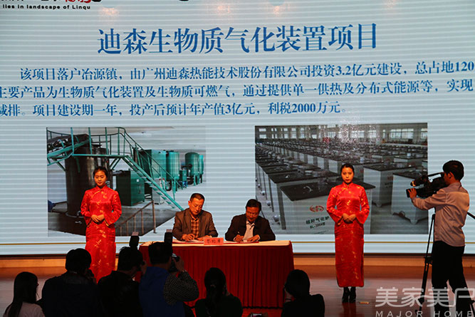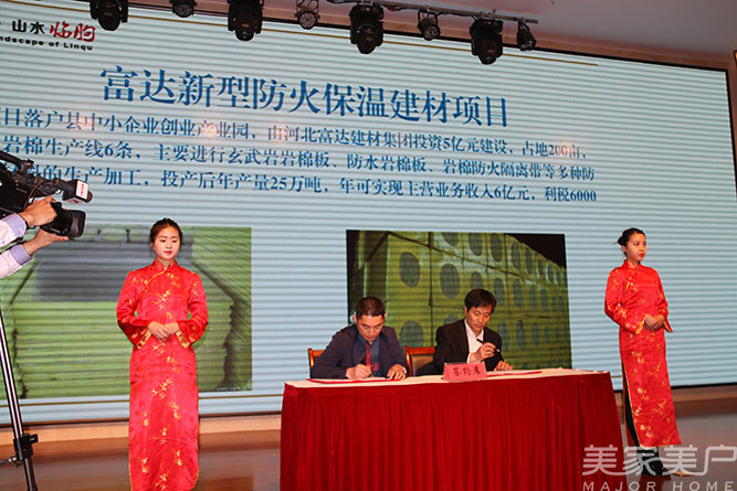 中共临朐县委副书记、临朐县人民政府县长刘裕斌(右)与广东省门业协会副秘书长喻凯(左)共同签约