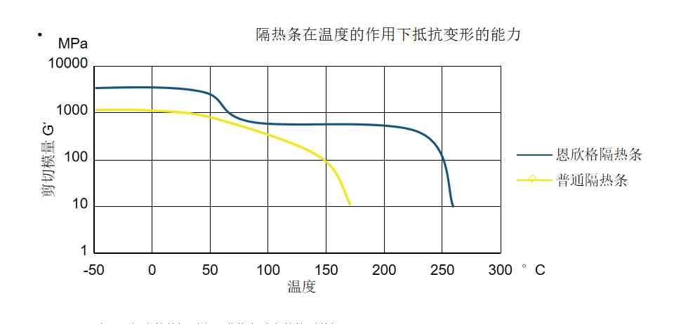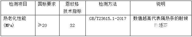 根据上述图标,我们可以了解到剪切模量随着温度的变化。当温度达到50℃时,普通隔热条的剪切模量设呈现急速下滑,性能不稳定;而恩欣格隔热条在达到此温度时,其下滑平稳,且可以保持到250℃之后,才出现急速下滑的现象。从以上的变化曲线,我们可以直观的了解到在同样环境下,恩欣格隔热条的性能变化或者性能衰减更加的平稳稳定。以恩欣格24mmC型隔热条为例,“GB/T23615.1-2017”国标要求为标准,恩欣格隔热条“热老化性能”。具体参数如下: