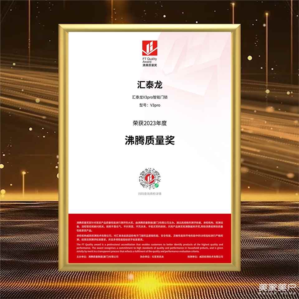 在专家评审、网络票选等一致评定下,汇泰龙从众多品牌中脱颖而出,荣获“2023智能锁行业消费者喜爱品牌”;汇泰龙D2pro智能锁斩获“2023智能锁行业科技创新奖”;汇泰龙V3pro智能锁赢得“2023智能锁行业质量安全奖”。一举揽获三项大奖,汇泰龙光芒四射!