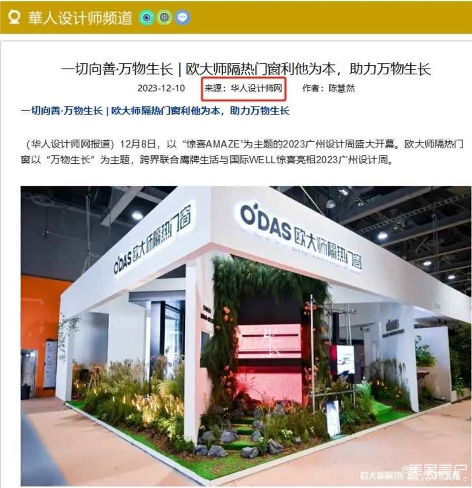 在2023广州设计周上,欧大师隔热门窗的「万物生长」主题展馆还吸引了众多设计师媒体、建材行业媒体、门户媒体的关注。吸引了腾讯家居、网易家居、慧亚网、中国陶瓷网、广东门窗协会、中华门窗网、中华设计网等数十家主流媒体报道。流量热度空前高涨,开启“现象级”刷屏模式,总浏览量超过1500万次!