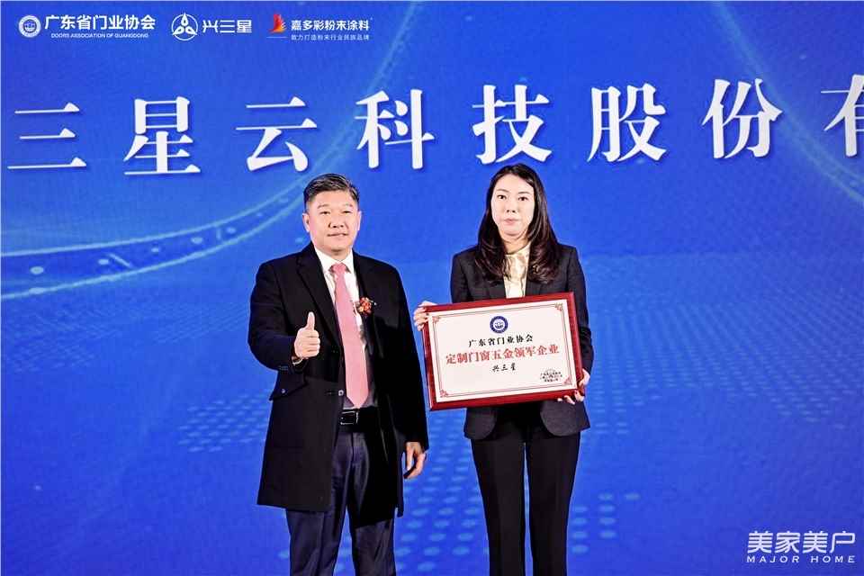 荣获“定制门窗五金领军企业”荣誉(兴三星云科技常务副总裁陈玮琦上台领奖)