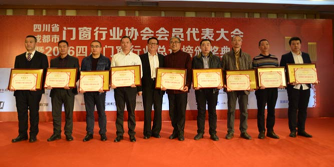 大会期间,为引导和鼓励企业加强品牌建设,提升品牌价值和效应,促进行业的科技进步和门窗市场的有序竞争,宣传推广四川优秀企业,增强四川门窗行业品牌影响力、知名度和整体水平,协会进行了年度行业总评榜的评选,百年天天木门在本次大会上获得最重量级的两大殊荣:公司获得“2016四川门窗行业领军品牌”奖项,董事长张天俊获得“2016四川门窗行业风云人物”奖项。