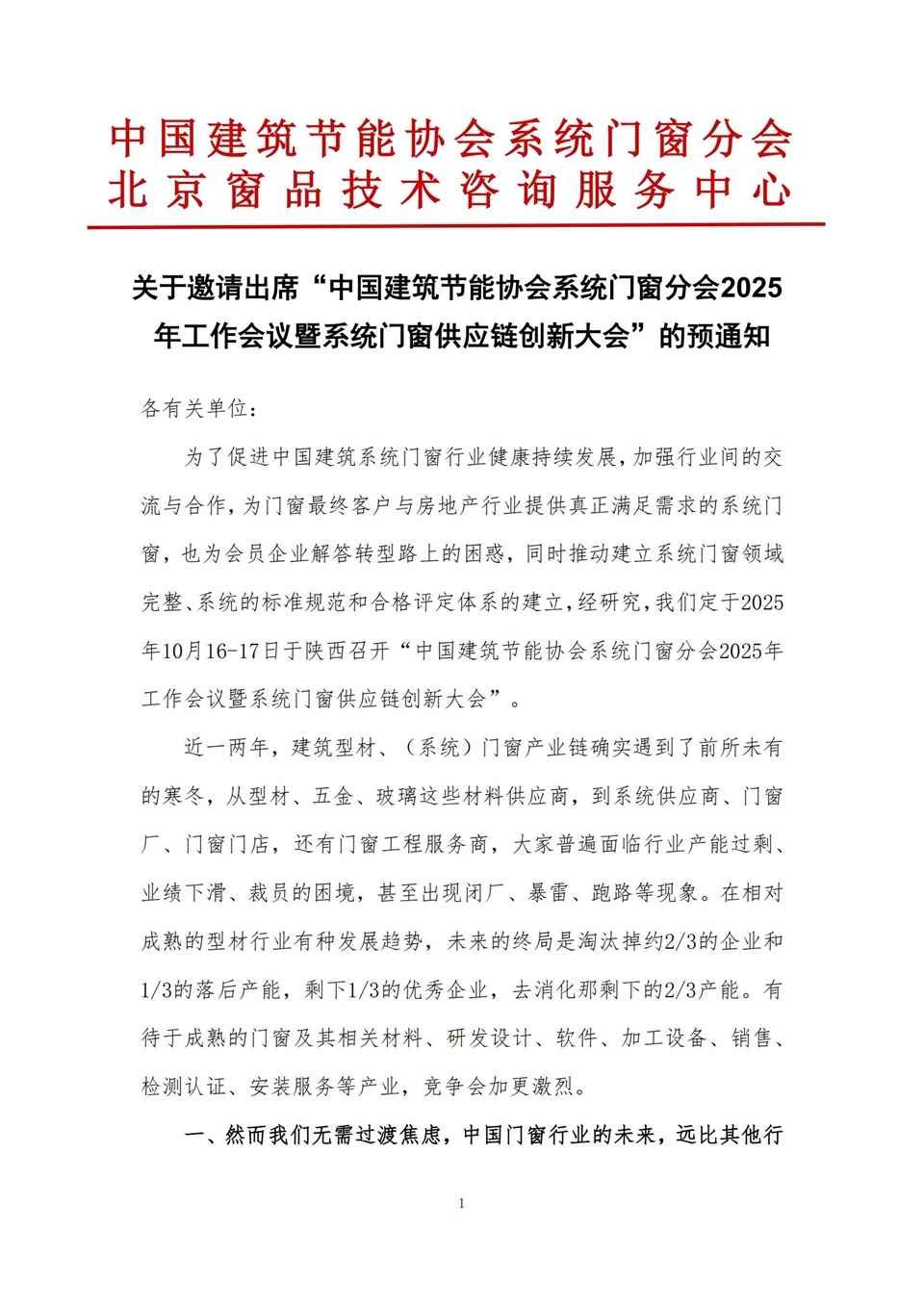 关于邀请出席“中国建筑节能协会系统门窗分会2025 年工作会议暨系统门窗供应链创新大会”的预通知