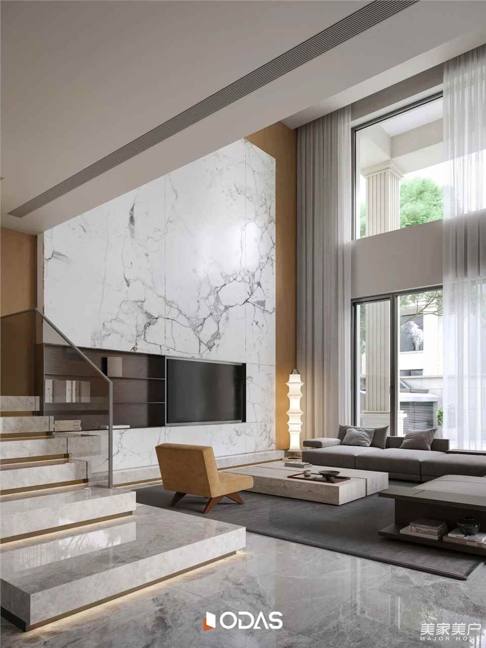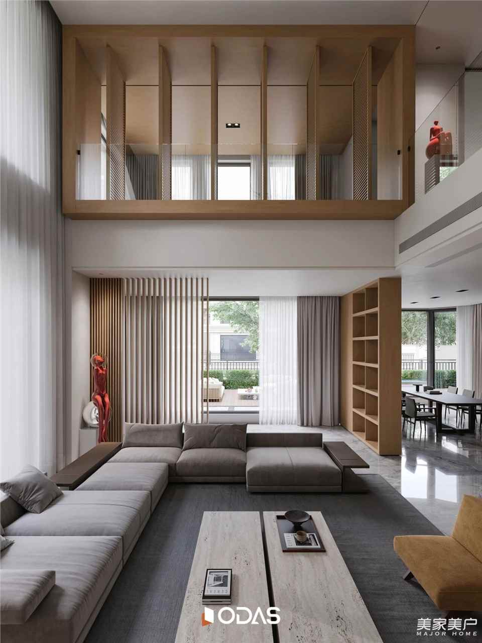 步入客厅,面向庭院的空间豁然开朗,温暖明亮。二层固定玻璃投下的光影像琴键般弹奏出优雅旋律,无论是家庭团聚还是招待宾客,这里都温柔包裹着回家的人。超大落地窗将室外景色“嵌”进室内,让空间成为风景的延伸,让自然持续参与家的塑造。