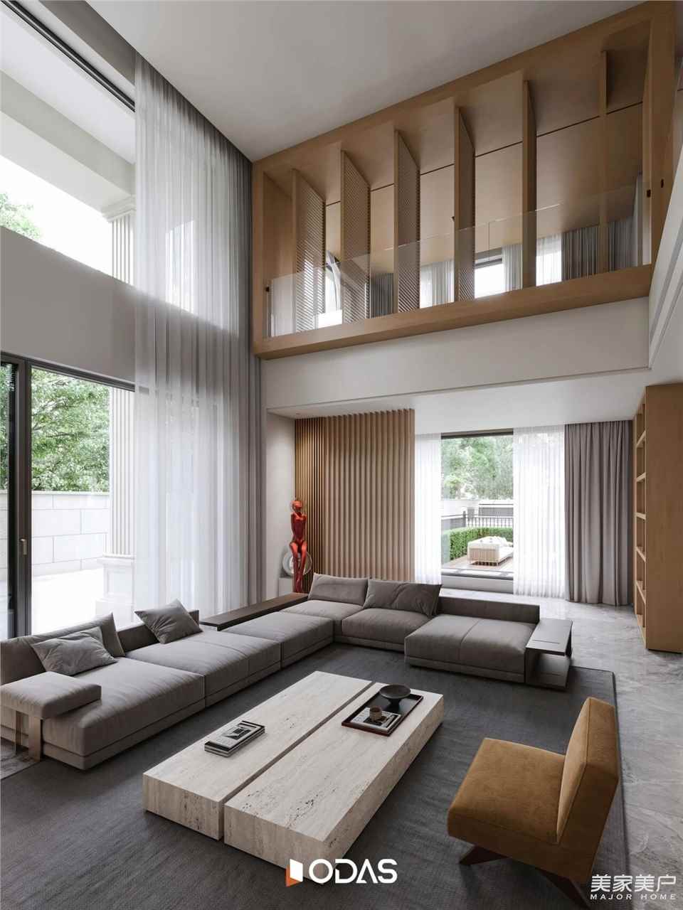 设计师认为,空间是骨骼,硬软装则是内在气韵。为契合业主年轻个性化精神需求,整体布局以“平衡共生”为纲,材质选择透着对“自然”的敬畏,温润洞石与木质材料搭配,与门窗金属材质形成平衡对话。艺术茶几、雕塑摆件等生活气息物件有序分布,空间去除多余装饰,回归纯粹休憩氛围和静谧感受,满足业主功能与形式并存的需求。