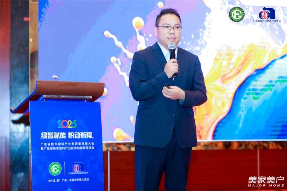 广东省粉末涂料产业技术创新联盟理事长彭浩民先生在致辞中强调,当前,粉末涂料行业正处于转型升级的关键期。一方面,我国粉末涂料市场格局深度调整,2024年全国粉末涂料总销量上涨6.6%,达265万吨,但广东省粉末涂料总销量下降5.6%,建材类粉末涂料总销量下降10%以上,而且行业仍面临中低端产能过剩、同质化竞争激烈、中小企业技术短板突出等挑战,亟需通过技术创新与产业链协同破局突围。另一方面,国家“双碳”战略持续深化,新质生产力领域蓬勃发展,新能源、新材料、人工智能、低VOC排放导向下的漆改粉高端应用领域前景广阔,为、市场打开了高端应用的新空间。面向未来,希望联盟各成员企业聚焦战略方向:以技术攻坚突破产业瓶颈,以产业链整合重构竞争优势,以绿色智能制造拥抱行业变革。