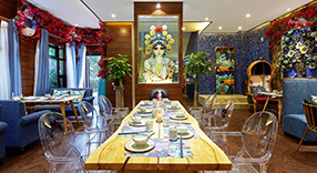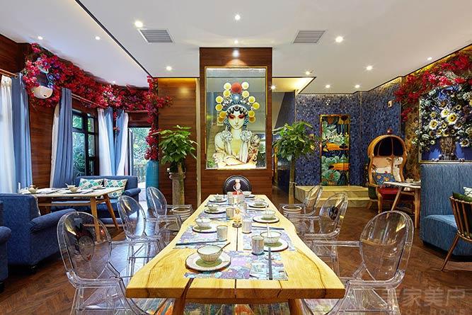 同样的是混搭,这里的点睛之笔便是眼前的京剧刀马旦装饰,通透的背景让其栩栩如生,盔头的绒球与天花两侧的鲜花相映成趣,绝美且浓富诗情。不知享用美食时会不会发出“嗟时时,觥筹断落残花里”的感悟呢?