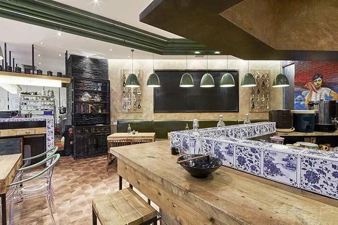 一眼望去,有在小空间里使用墙面进行的创意装饰和有趣墙绘,也有原木风格和清新绿调的活力混搭,但最让人眼神驻足的,无疑是案前的青花瓷元素,传统的中国青花瓷分割了厨房区域和用餐区域,合理配置空间使得空间利用率达到最高,同时也让店面点缀出独有的文物风情。