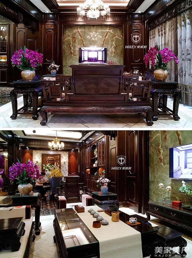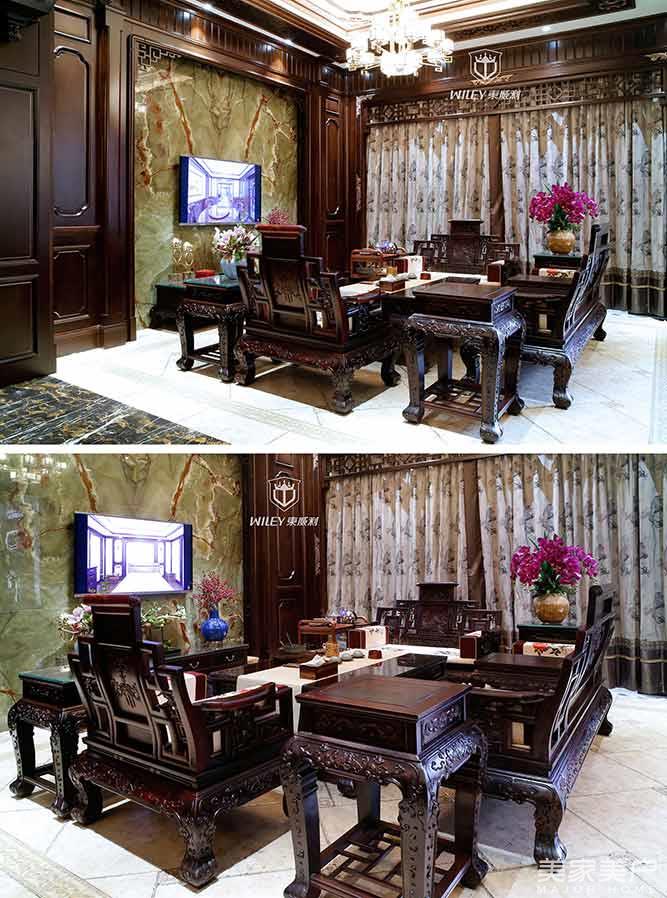 中式客厅设计传承了中国几千年的历史文化,每一个角落都充满了儒雅敦厚的古典气息,格调高雅,造型朴实优雅,色彩浓重而优雅,给人一种悠远、宁静的文化韵味。