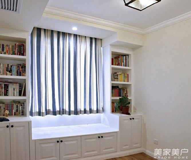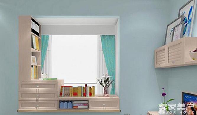 原木色的书柜设计,淡蓝色的墙面设计,雅致且精巧,配以蓝绿色的飘窗设计,微风拂过,给人的感觉像是到了沙滩上,闻到了来自海洋的气息。