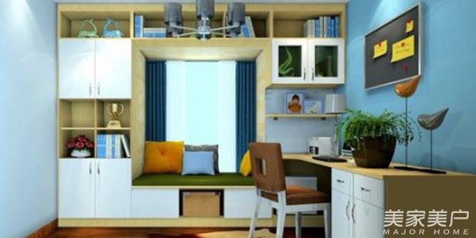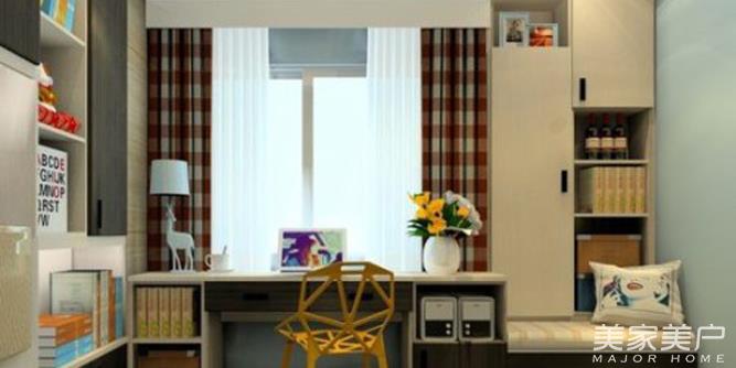 从实际需求出发,将收纳柜嵌入窗台,隐蔽式储物设计,让整个空间保持干净、整洁。其次,还可以根据自己的个性需求,靠窗延伸设计书桌,一个小空间能同时满足两个人的阅读办公需求。