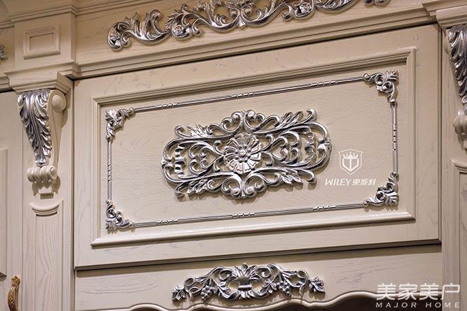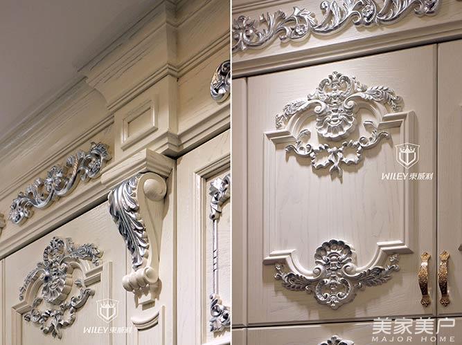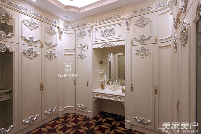珍珠白的衣帽间采用半开放加银光纹的油漆工艺,使得粗犷木纹在光照下有一种闪银的质感。柜门上的法式雕花件做了擦银效果,更是让衣柜整体看上去充满法式的奢华尊贵。