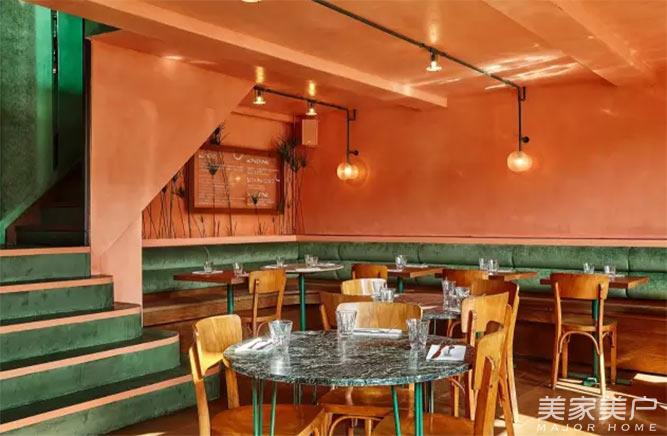 在红色砖墙的建筑之中,透出深邃的绿色。屋内一片热带景象,不仅精心布置植物,就连墙面等装饰也都充满了绿色。木、皮、大理石等天然材料的运用也都相得益彰,而角落里的一抹粉色更是惊艳。