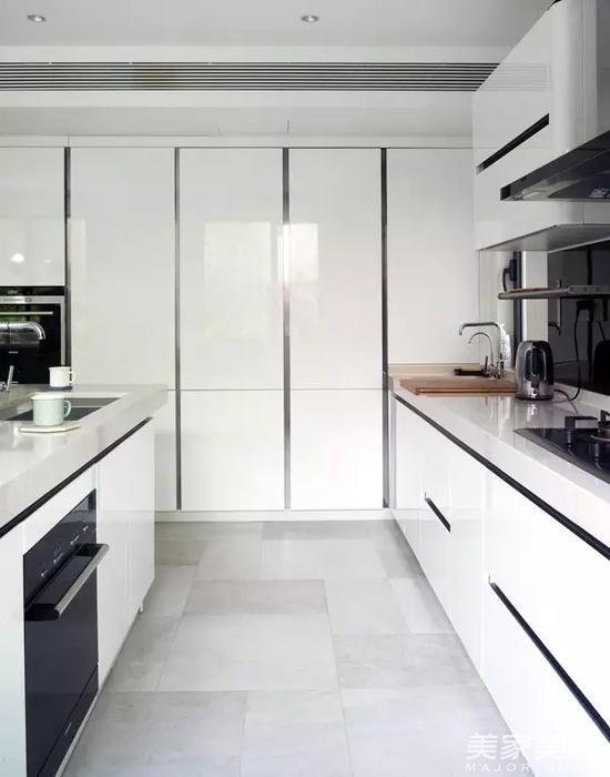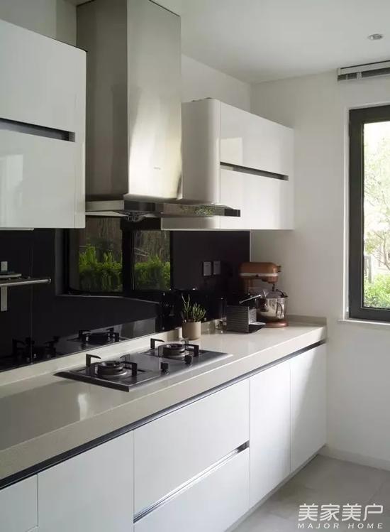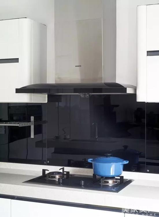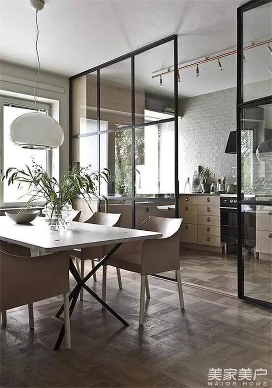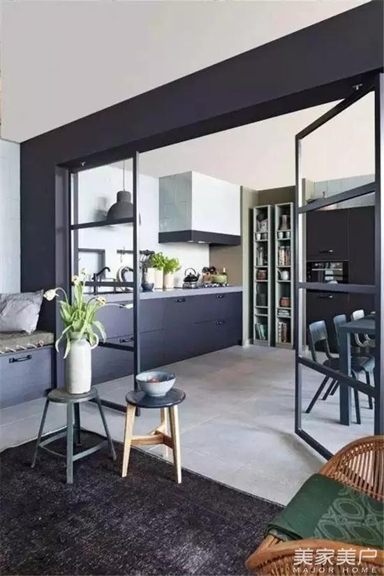 如果饮食习惯偏重口、油烟太多的话,在厨房设计上可以考虑这种半开放式的厨房。半开放式和开放式功能几乎一致,并在阻隔油烟的功能上更胜一筹。通过玻璃墙或推拉门的隔断,让空间变得敞亮的同时也形成了较好的延伸感。