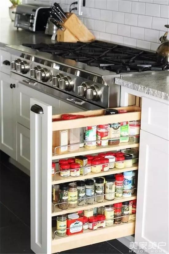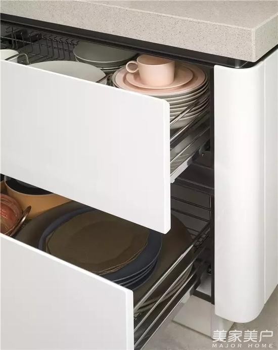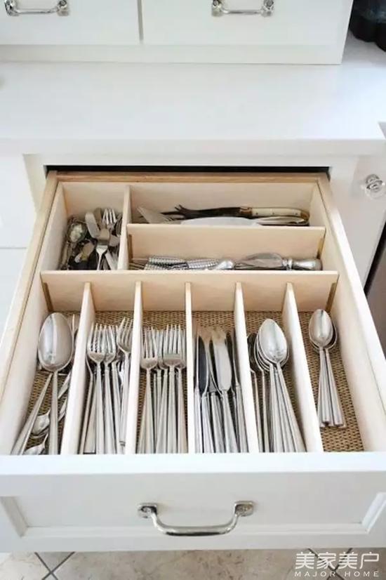 抽屉存放刀叉厨具都是极好的,内部可以使用一些分类隔板,把不同类别的物品分隔开,便于寻找、拿取。