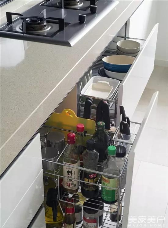 橱柜是厨房收纳最重要的载体,也是最大的存储区域。因此收纳功能必须精细人性化,橱柜的每个柜子的储藏空间都不能浪费,不同的工具有特定的位置去收纳,所有抽屉都可以进行个性化的配置。通过合理安置,让橱柜整齐有序,更美观大气。