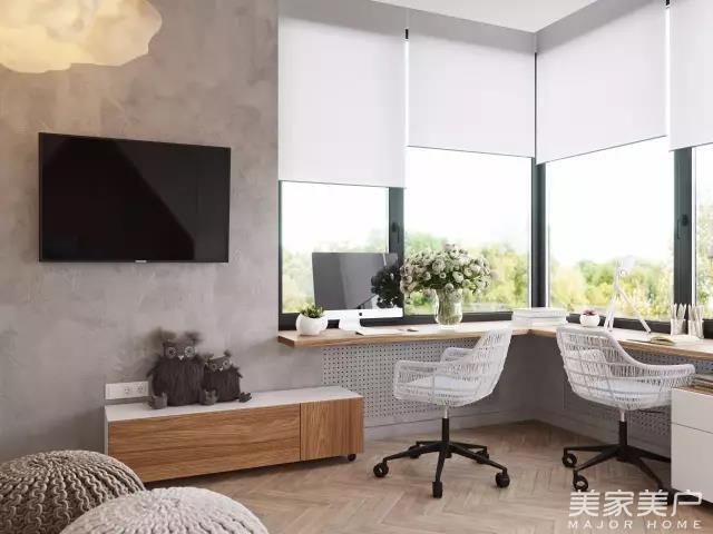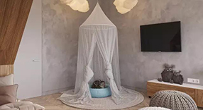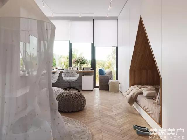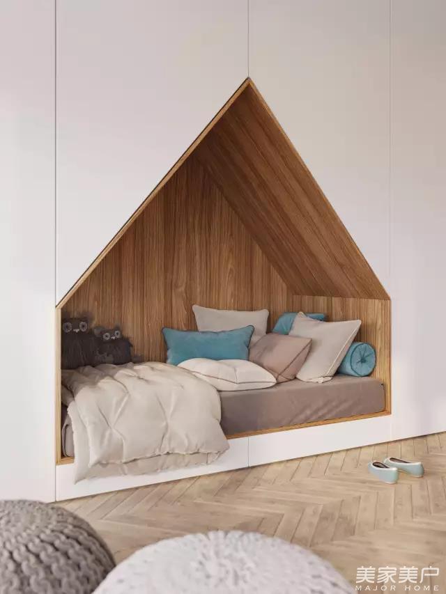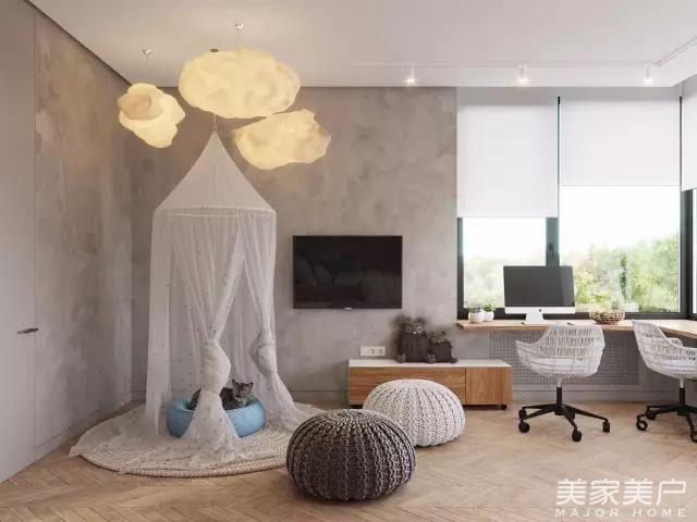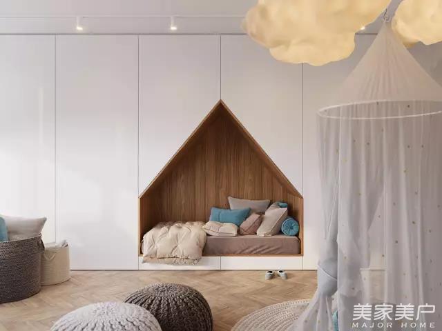 将床安置在墙体内,与储物空间融合,为房间提供更大的活动空间。写字台的集中在房间的一角,也是出于相同的考虑。云朵般的灯具与小纱帐增添了一些梦幻气氛。与木地板呼应,也为房间里增添一些舒适感。