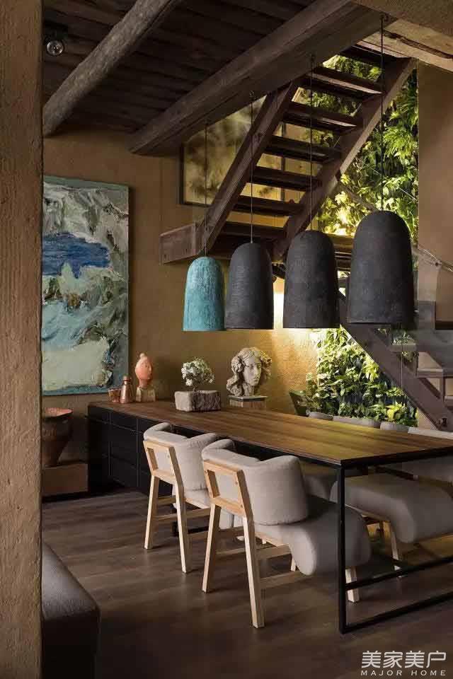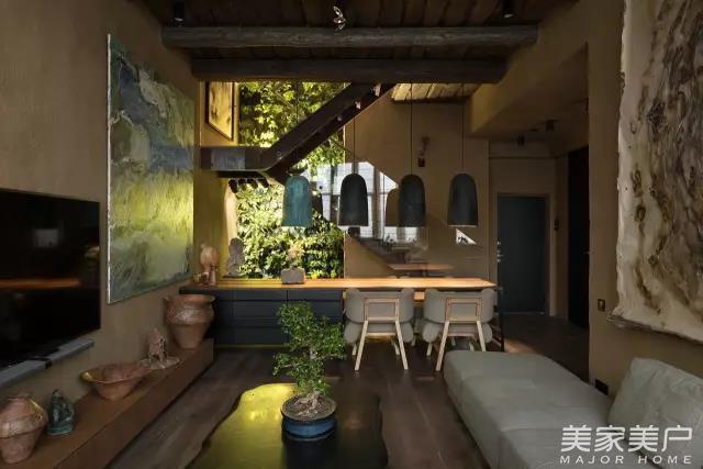 这套双层公寓的墙壁都使用粘土,这是一种古老的乌克兰建筑技术,传统手工地毯体现出乌克兰的精湛工艺文化。支撑天花板和门道的粗糙木梁营造出清雅的乡村风格。盆景树和屋顶花园给公寓增添了东方特色。然而公寓配备了现代设施,使居住更舒适方便。