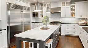 解决方案:在厨房面积足够大的前提下,功能布置须合理,尽量配备嵌入式电器使之整体化:比如冰箱等大型电器嵌入柜体,空间不显凌乱;在L形厨房中加装一个便餐台或料理台面,便于多人同时使用;而整体厨房中可考虑设置吧台,在下面设计脚踏,让用膳、品酒都成为一种享受。
