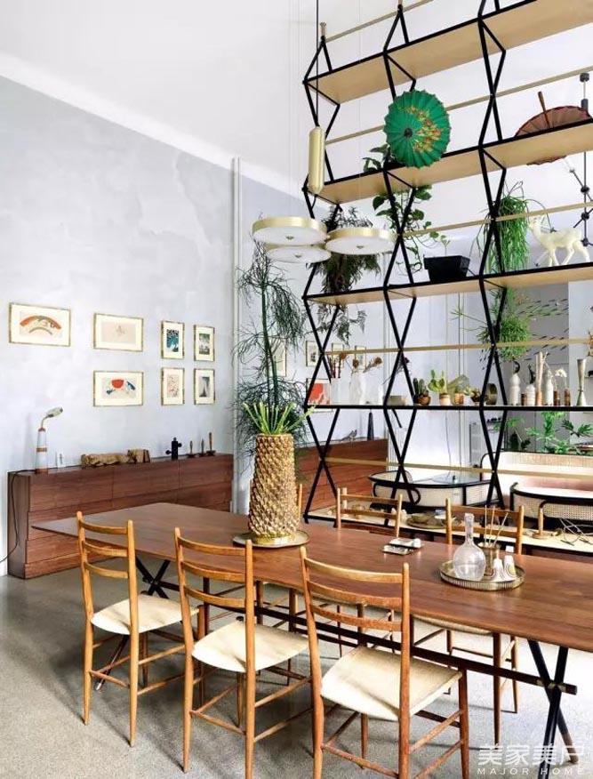 绿色植物环绕的公共区一角,有的绿植置于Ginko Exhibitor搁物架上,接近天花板。搁物架也由主人设计。