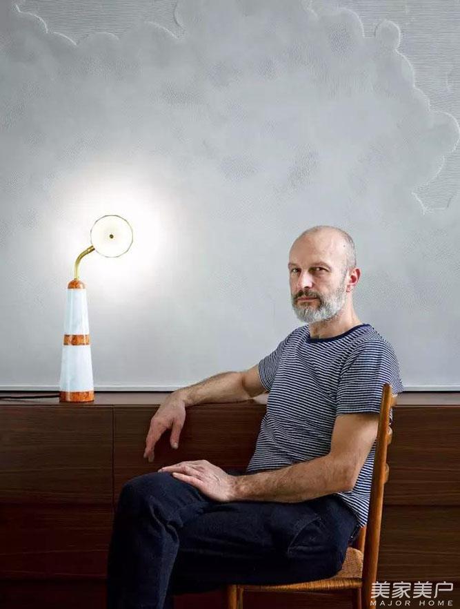 Pietro Russo坐在自己设计的Alma办公桌旁。Trabea挂式书架,以及左边墙壁上(画面正前方)如黄水仙花般的镜面黄铜灯具“水仙灯与镜面”(Daffodil Lamp & Mirror)均由他设计,灯具名字颇能“顾名思义”。