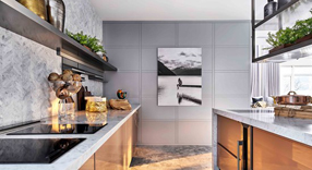 一经对空间结构的精微调整,中西分区的开放式厨房布局也得以在更完整和宽裕的空间内施展,餐厅因此有了更贴近自然的景观向位。厨房的立面处理选用大面积大理石进行几何式拼贴,赋有柔暖光泽的黄铜橱柜饰面作为搭配,让开放式餐厨看上去充满经典时期摩登(Modernism)的设计感和时代特征。
