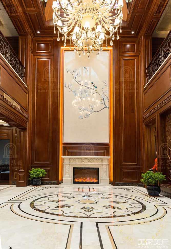 往前便至整个别墅精魂所在,两层的挑高赋予整个空间朗朗气韵,大幅中式花鸟画将中式传统意蕴舒缓,欧式壁炉的点缀,在硕大的水晶吊灯掩映下,整个空间熠熠生辉。受中国传统思想天圆地方的影响,加以圆形水晶灯中和天顶、空间的锐气,流光溢彩。