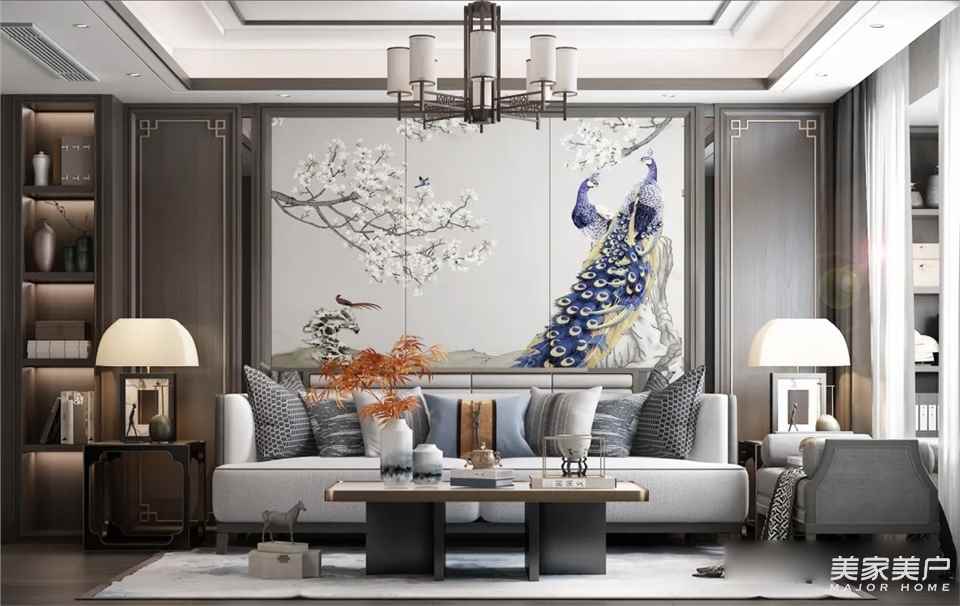 像花鸟山水这些元素是中式风格里非常常见的元素,把背景墙贴上这些儒雅图案的壁纸,然后搭配上现代舒适的家居,也可以营造出独特温馨的气息。