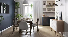 很多小户型空间除了把餐厅与起居室设置在一起之外,把餐桌摆放到厨房里面也未免不是另一种方法。搭配上天花板的老式吊灯,暗黄的灯光落在用餐空间里面,朴素、怀旧的氛...