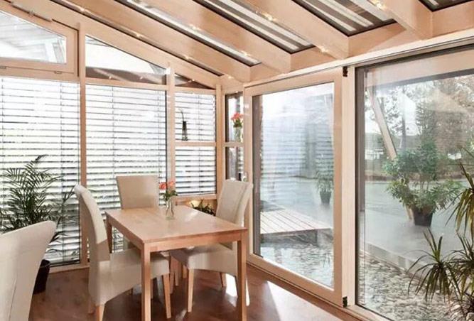 铝木阳光房最早起源于德国,这种节能环保的智能化建筑,具有优越的保温隔热、防水防紫外线的功能。其室内侧采用优质的实木,贴近自然的木结构给人更舒适的亲和感;室外则是优质的铝合金材质,可根据个人喜好更换色彩,带来更加前卫、时尚的建筑风格,尽情享受高品质的生活。