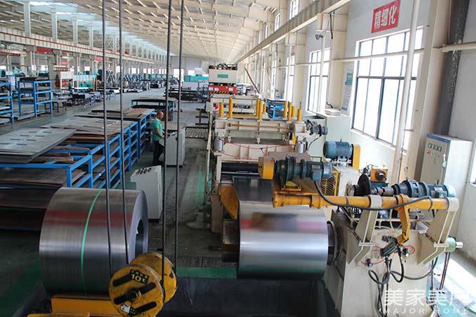 据介绍,工厂原料进入车间,从钢板裁切、门框成型、门花压铸、喷漆等都是自己完成的。整个车间到处是机械设备,人员用的较少。就拿门框成型这道工序来说,过去先丈量、裁切、压弯、成型等多步骤,现在采用新的设备,门框一次成型。原来做这道工序需要二三十人,现在只需二三人就行了,大大提高效率的同时,产品质量也大大提高。