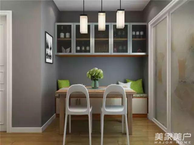 考虑到空间布局的限制,带卡座和吊柜的餐厅则让小户型空间看起来更加宽敞。餐厅与厨房以推拉门为界,一改平开门占据空间的缺陷,空间更通透。餐厅位置虽然不大,配以适当的软饰和鲜花,营造轻松的用餐环境。