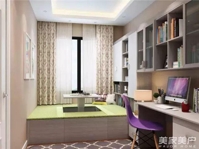 带升降台的榻榻米、书桌柜,简单的搭配组合完美利用空间,打造多功能区。榻榻米可当床和储物柜,实现收纳和休息,书桌柜可学习和工作,实现一房多用,正是小户型主人的最爱。