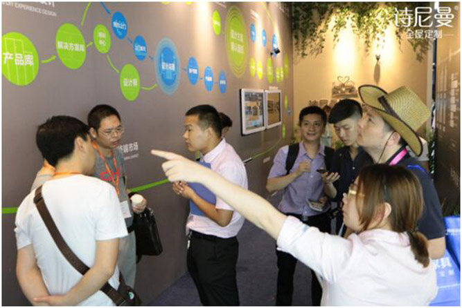 本次建博会上,诗尼曼展馆设计别出心裁,高端大气,诗尼曼全屋定制展馆总面积超1000平方米,双层设计,集高雅、柔美等气质于一身,无疑又成为人群蜂拥而至的焦点。展馆以科技、时尚、创新、绿色为设计元素,完美展现了诗尼曼全屋定制健康环保的家居生活理念。