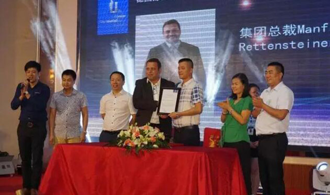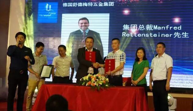 晚会上钟董与舒德梅特总裁曼德先生签定战略合作协议