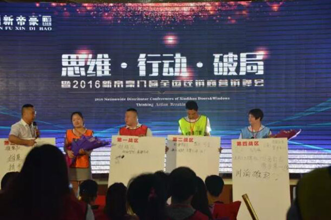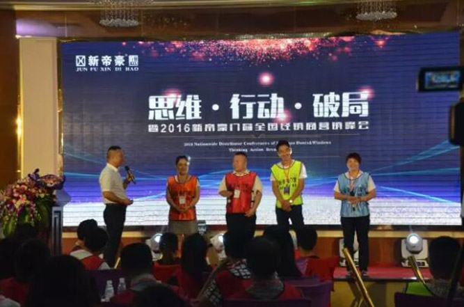 2016年7月7日,以“思维•行动•破局”为主题的“新帝豪门窗2016新品发布暨营销峰会”在佛山大沥盛大召开。出席本次峰会的有“新帝豪门窗”董事长钟金福、营销总监汪总等高层领导以及全国各地经销商等。