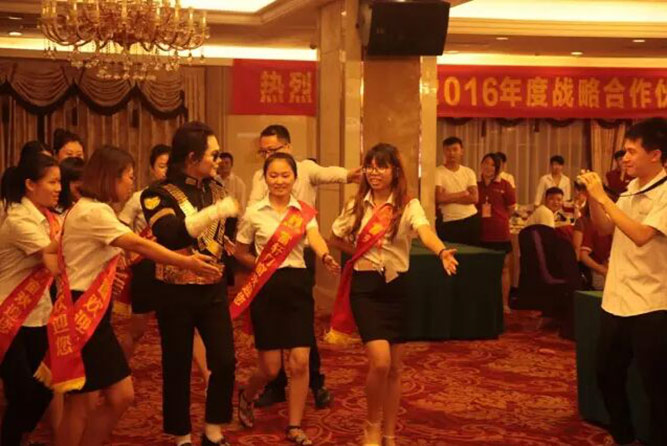 觥筹交错,欢声笑语,富轩李董与家人们一起共进晚宴。期间,举行了颁奖典礼,分别颁发了2015-2016年度最佳品牌潜力奖、最佳品牌合作奖、最佳品牌成就奖,恭喜获奖者,也非常感谢全国各地的加盟商为富轩的进步贡献自己的力量和汗水。一个个精彩节目穿插上演,富轩外贸部《爱》手语舞、销售部《霸王别姬》舞蹈、加盟商演唱经典歌曲、MJ模仿者劲歌热舞、专业爵士舞表演……当然,还有激动人心的抽奖活动,现场欢呼声、掌声雷鸣般响亮,高潮迭起。富轩家人们喜不胜收,共同渡过了一个美妙而激动人心的夜晚。难忘今宵,让我们相约明年再见!